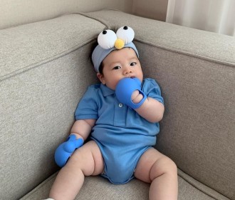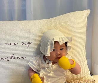 It's a cute baby who munchs on glove teether~ o(*^@^*)o
