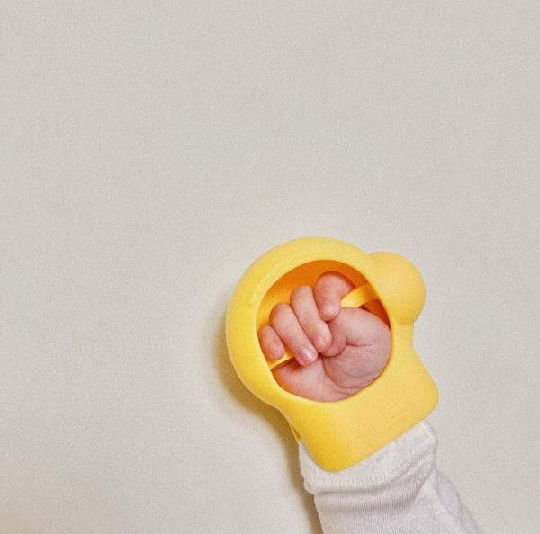 It's a baby who takes anything to his mouth, perhaps because his gums are itchy!